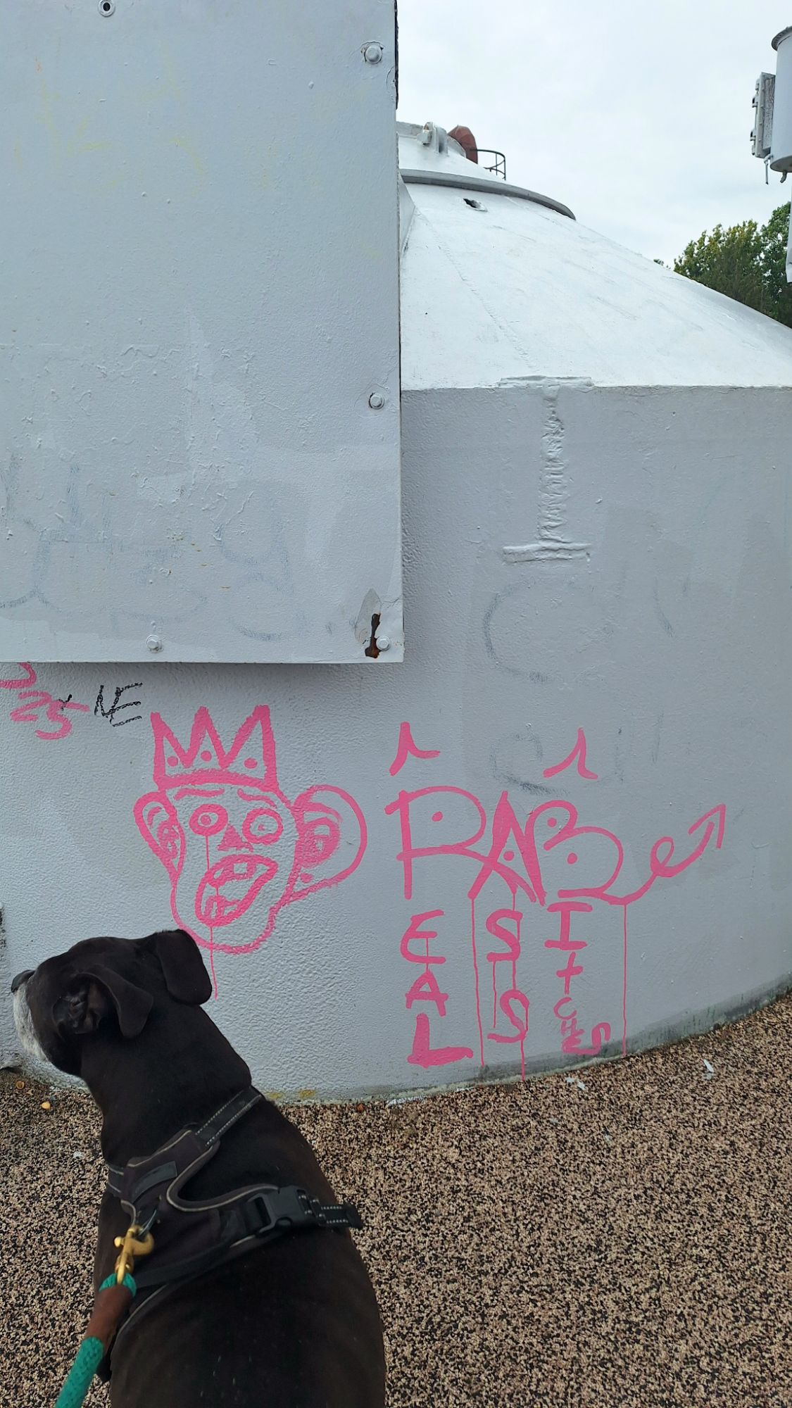 On a round and pale grey feature next to it, someone used bright pink spray paint to write “Real Ass Bitches” next to the face of a person wearing a crown.