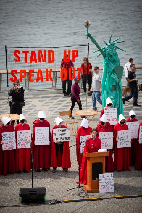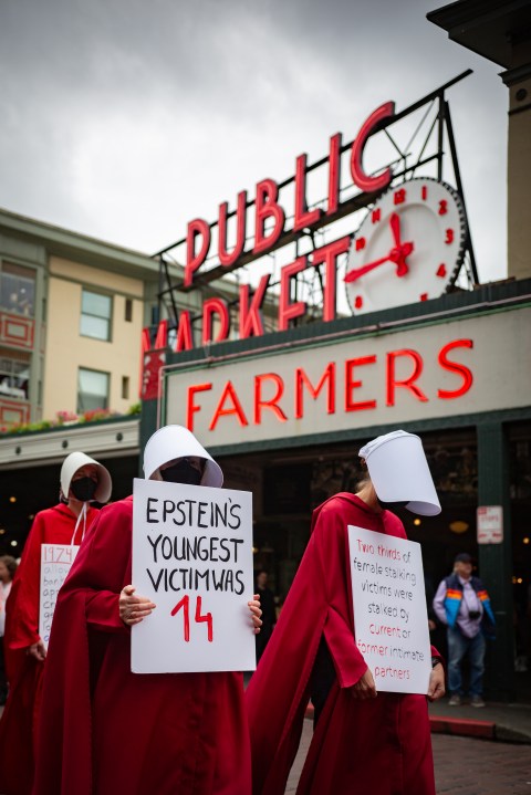 Small groups of Handmaids walked through Pike Place Market, weaving through crowds of tourists and other visitors to group up and form a line holding signs that read “1 in 5 women will be RAPED in their lifetime,” and “Epstein’s youngest victim was 14.” These 40 handmaids were pivotal in bringing attention to the incessant targeting of women’s rights in the U.S for the September 7 Women’s Rights Rally at the Seattle Waterfront, organized by DefundMusk.