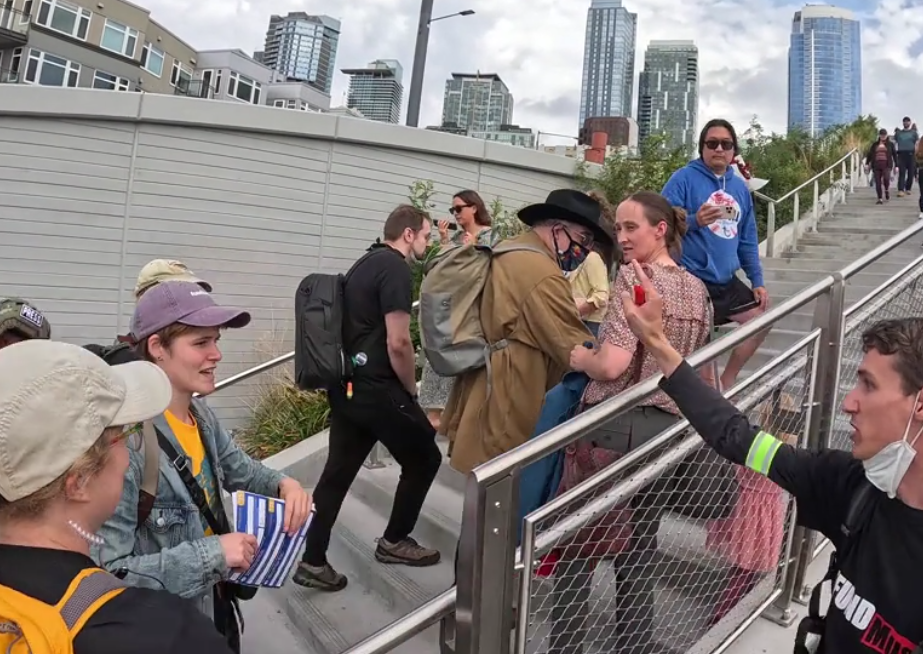 As Wilson was walking up the steps to leave the venue with her young daughter, far-right content creators Jonathan Choe, Matthew Adams, and Vivian Ivy— who’s real name is Jessica Jane McClure— surrounded Wilson with their recording devices. Choe was filming her and her daughter while moving in closer as he peppered her with questions, as Vivian Ivy, sporting a helmet and a vest, followed his lead.