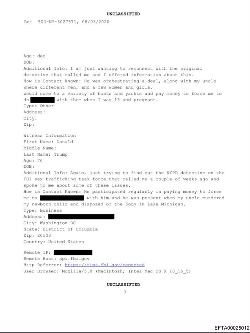 “He participated regularly in paying money to force me to [REDACTED] with him and he was present when my uncle murdered my newborn child and disposed of the body in Lake Michigan,” the victim wrote in follow-up correspondence to the FBI in 2020.