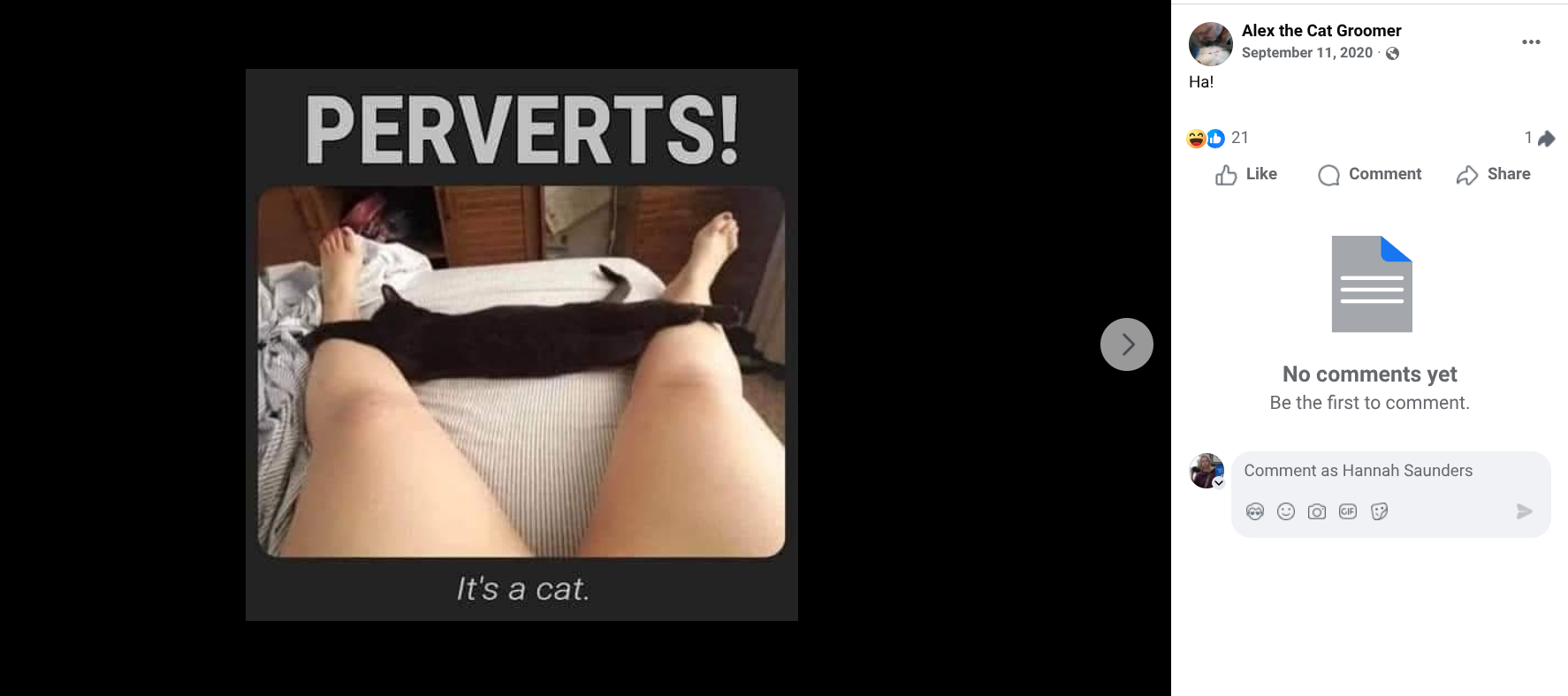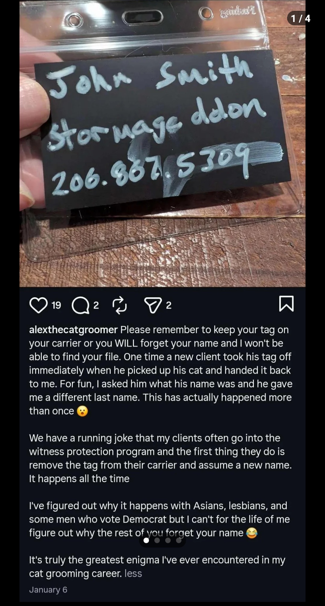 Alex Perry, who’s been running his own cat grooming business called “Alex the Cat Groomer” in Bothell for 11 years, promotes racism and sexism through his business, and has a history of being rough with cats— and sexualizing them. In a now-deleted Instagram post dated January 6, Perry uploaded a picture of a name tag with cell phone information on it, and said people need to keep these tags on the carrier at all times.