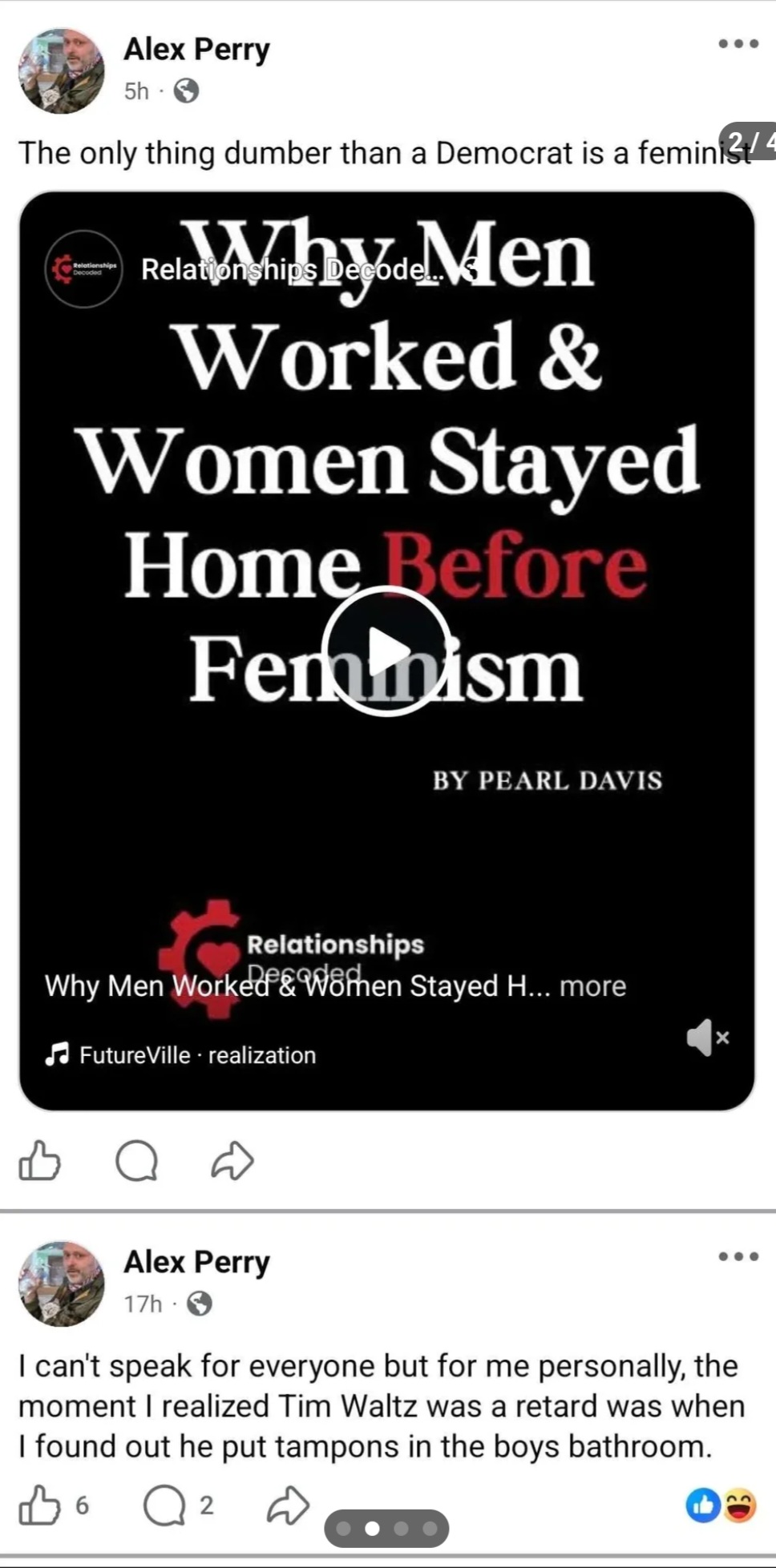 This has seemingly been a consistent issue for Perry, as he created a similar post on his cat-grooming Facebook page on April 24, 2024, but he did not take jabs at Asians, Lesbians, or men who vote Democrat. In a formerly public Facebook post on his personal account, Perry shared a video titled “Why Men Worked & Women Stayed Home Before Feminism.”