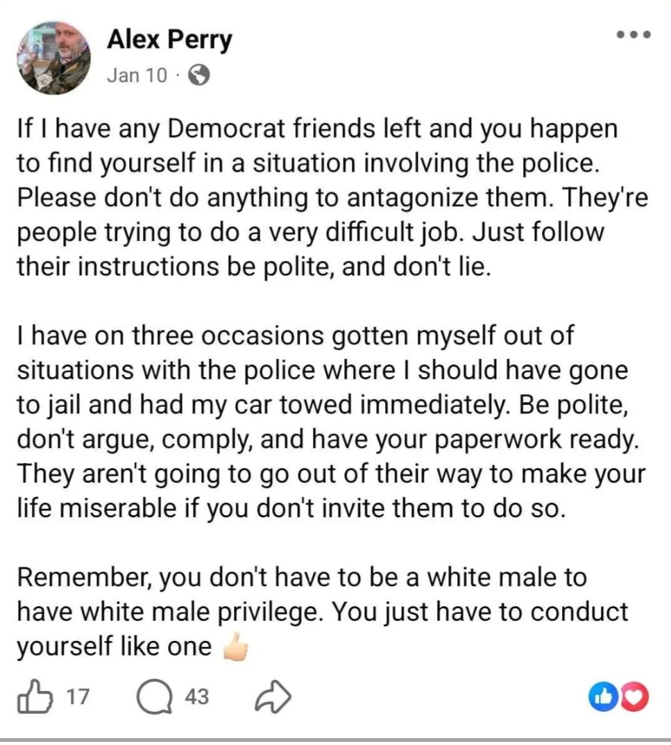 In another formerly public post, this time on his personal Facebook account, Perry talked about interactions with the police, and how people should present themselves. He said cops are simply doing a challenging job and that people should “just follow their instructions,” and “be polite.” He mentioned three instances where he should have gone to jail, but claimed police aren’t going out of their way to make people’s lives harder.