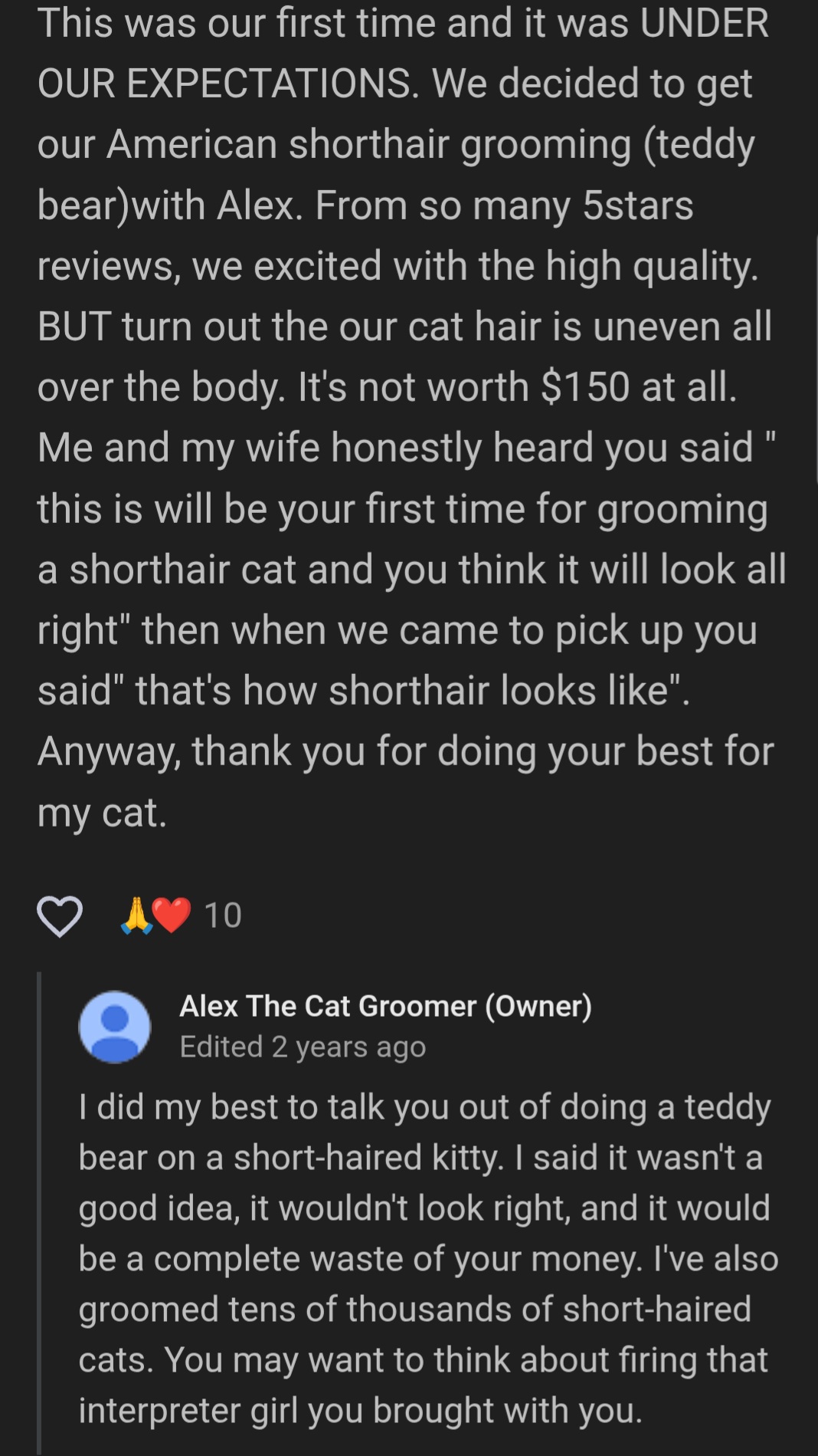 Two years ago, a first-time client had an American short-hair and wanted a “teddy bear” cut, and the review said it was uneven and not worth the money, but thanked Perry for the grooming service. Perry responded and said he tried his best, but that teddy bear cuts are challenging on short-haired cats and that he’s groomed “tens of thousands” of short-haired cats.