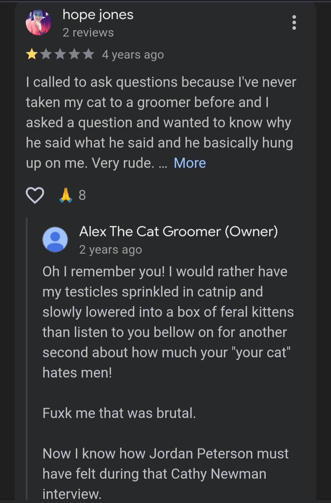 In another review from two years ago, a person who had never taken their pet to Alex the Cat Groomer called to learn more about the services, but said Perry was very rude and hung-up on them.