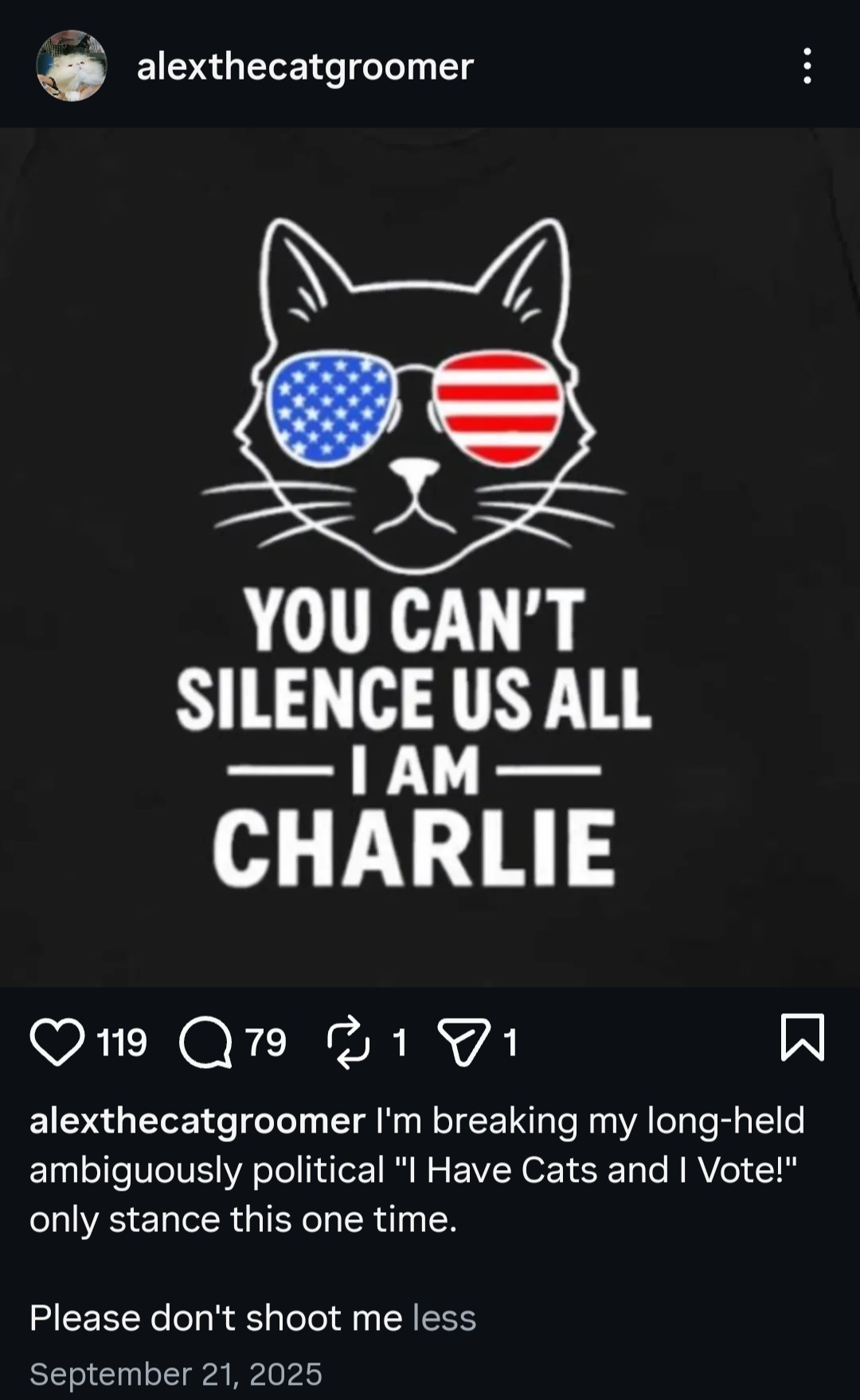 In September, Perry posted a photo of a cat wearing USA flag sunglasses with text beneath that said, “You can’t silence us all. I am Charlie,” referencing the murder of bigot and extremist, Charlie Kirk.