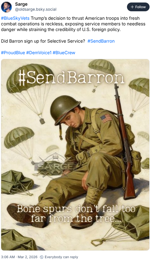 With his father’s attack on Iran that neglected congressional approval, social media users started a new trend: #sendbarron.