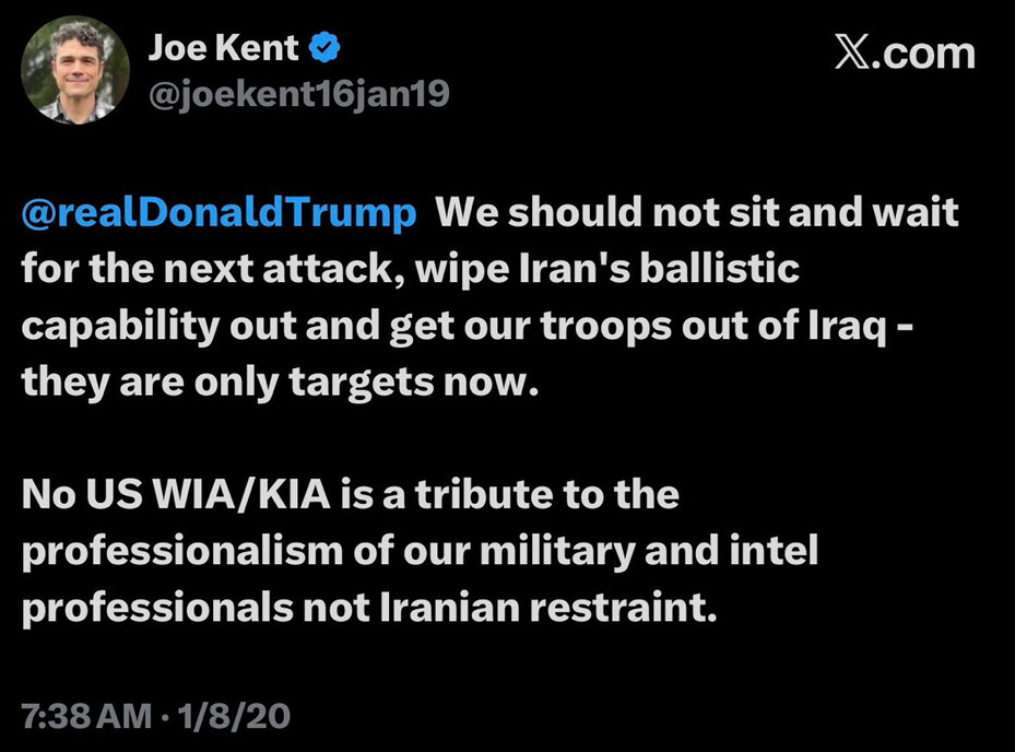 “We should not sit and wait for the next attack, wipe Iran’s ballistic capability out and get our troops out of Iraq – they are only targets now. No US WIA/KIA is a tribute to the professionalism of our military and intel professionals not Iranian restraint.”