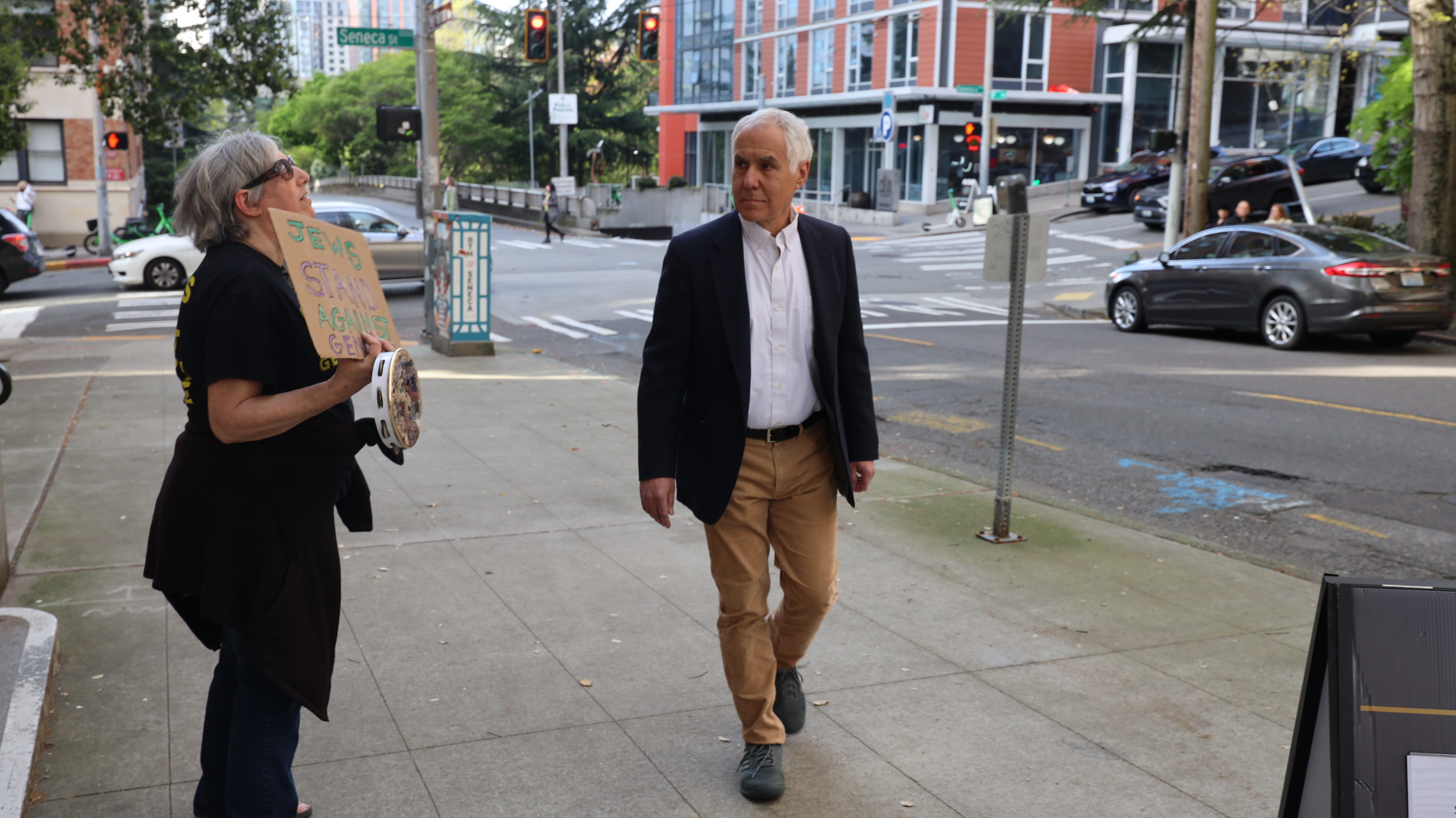 On the evening of April 19, Mercer Island-based nonprofit StandWithUs Northwest organized a speaking event at the Seattle Town Hall, located at 1119 8th Ave, that featured former IOF soldier Noa Cochva. The event was dubbed “Women Warriors – On the Frontlines in Battle and in the Courtroom.” About 50 protesters turned out to let the attendees and Cochva know she is not welcome in the City of Seattle, particularly not in a community gathering place like Town Hall.